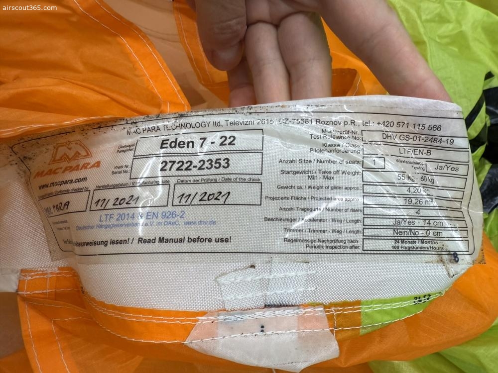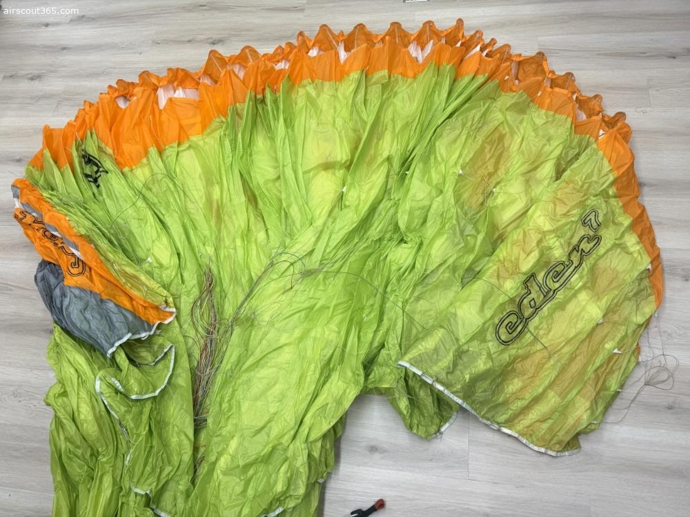 Ich verkaufe den gebrauchten Eden 7 meiner Frau in der Grösse 22 da sie nun C-Schirme fliegt. Er ist in einem guten Zustand mit ganz frischem Check, gültig bis 09.2027 und dem Prädikat 79%,Gesamtwertung, Porösität 86%. Er hat 149h und 188 Flüge drauf.Mit einer hervorragenden Dämpfung vermittelt er sehr viel Sicherheit. Man kann sich auf das Fliegen konzentrieren und muss nicht unnötige Informationen verarbeiten die einem nichts bringen. Er ist ein sehr guter Starter und in Semileichtbauweise aufgebaut. Er wiegt 4.20 Kg und kommt mit dem originalen Zellenpacksack und Handbuch. Er hat einen getapten Bereich, da sie im Keller an einem spitzen Gegenstand hängen geblieben ist. Dieser wurde innen und aussen sauber getaped - siehe Bilder.