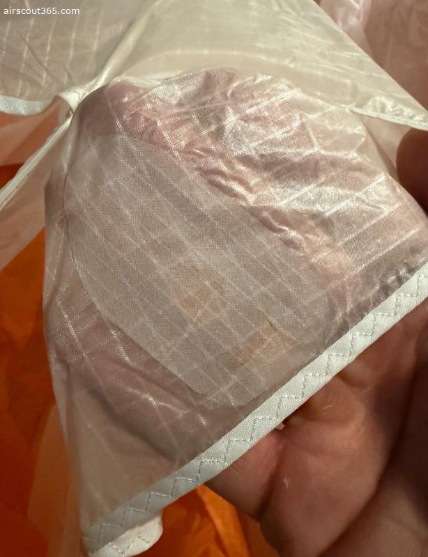 Es gibt ein Patch im Untersegel, das fachmännisch repariert wurde (von innen). Ansonsten keine Patches oder Flickstellen.